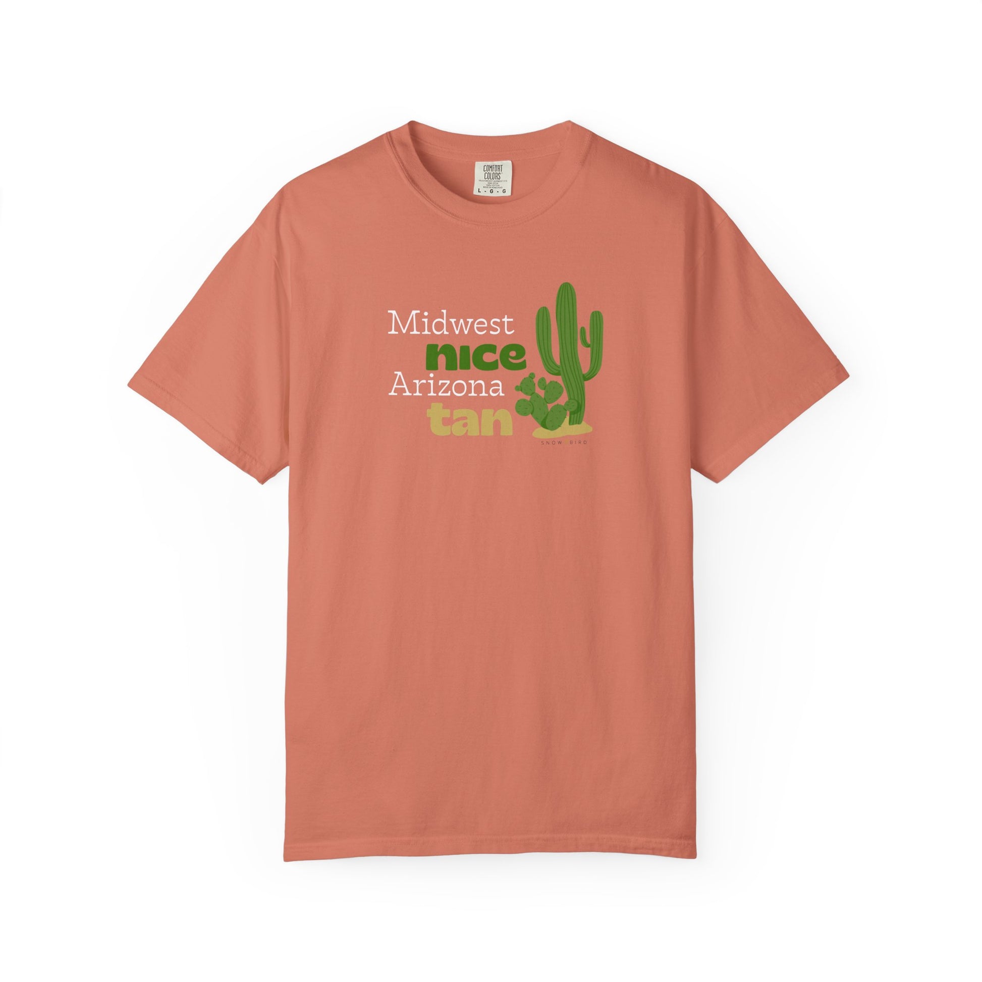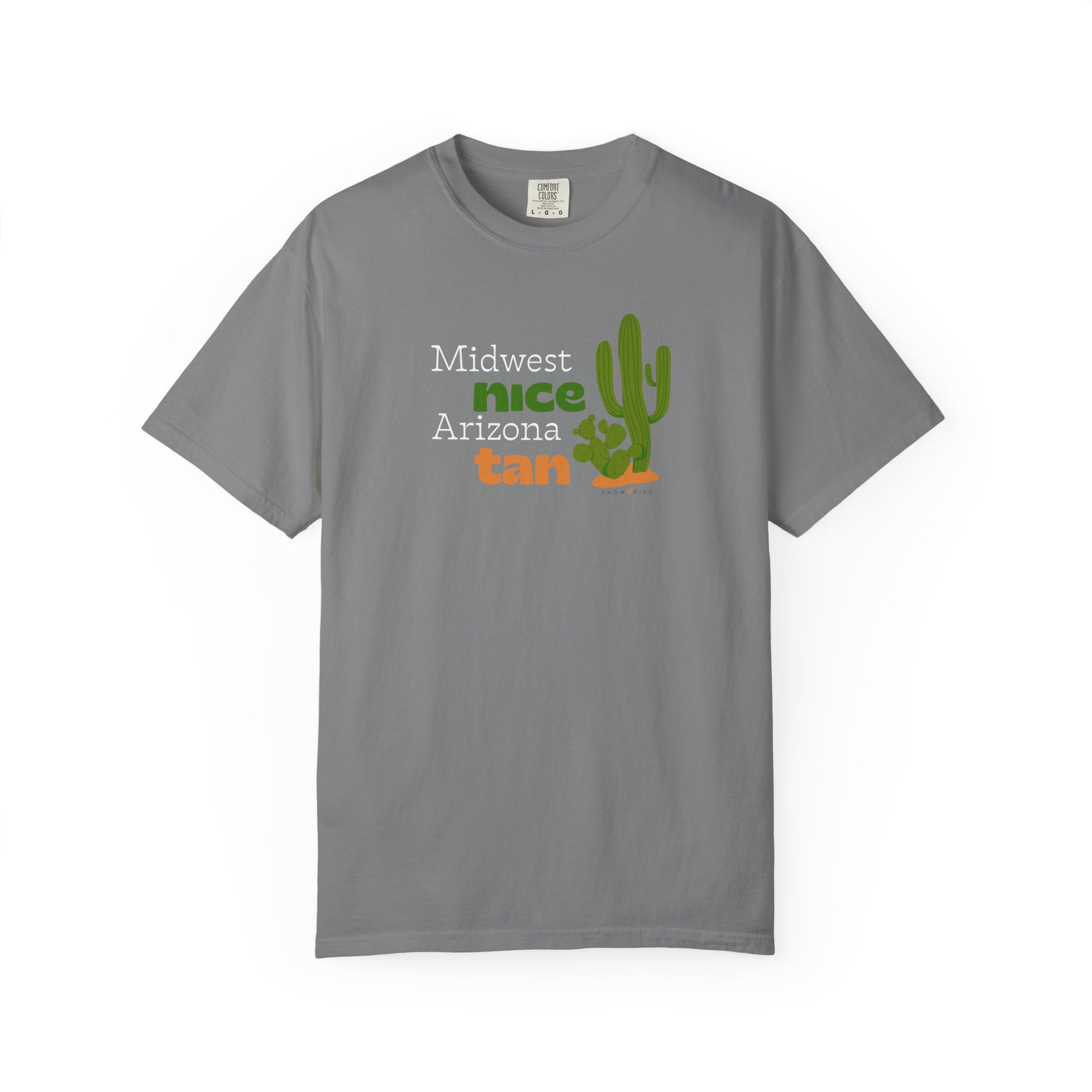Soft, airy, and delightfully cheeky, this Midwest Nice, Arizona Tan tee brings a smile with its friendly saguaro and playful nod to the snowbird life. It’s the perfect blend of heartland charm and desert glow: a reminder that you can take the bird out of the Midwest… but once you’ve perched in Arizona, you may never want to fly back.